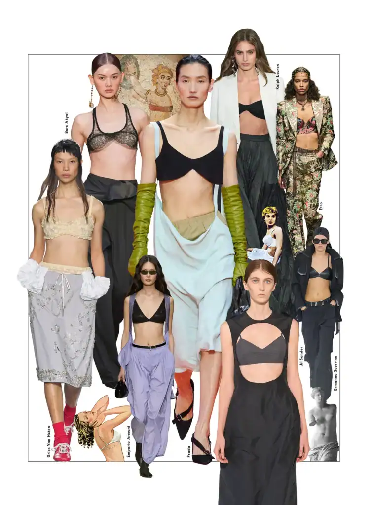 Il Reggiseno si trasforma da capo invisibile a elemento styling dichiarato: si intravede sotto blazer leggeri, si abbina cromaticamente al top oppure diventa protagonista sotto camice trasparenti e maglie crochet.